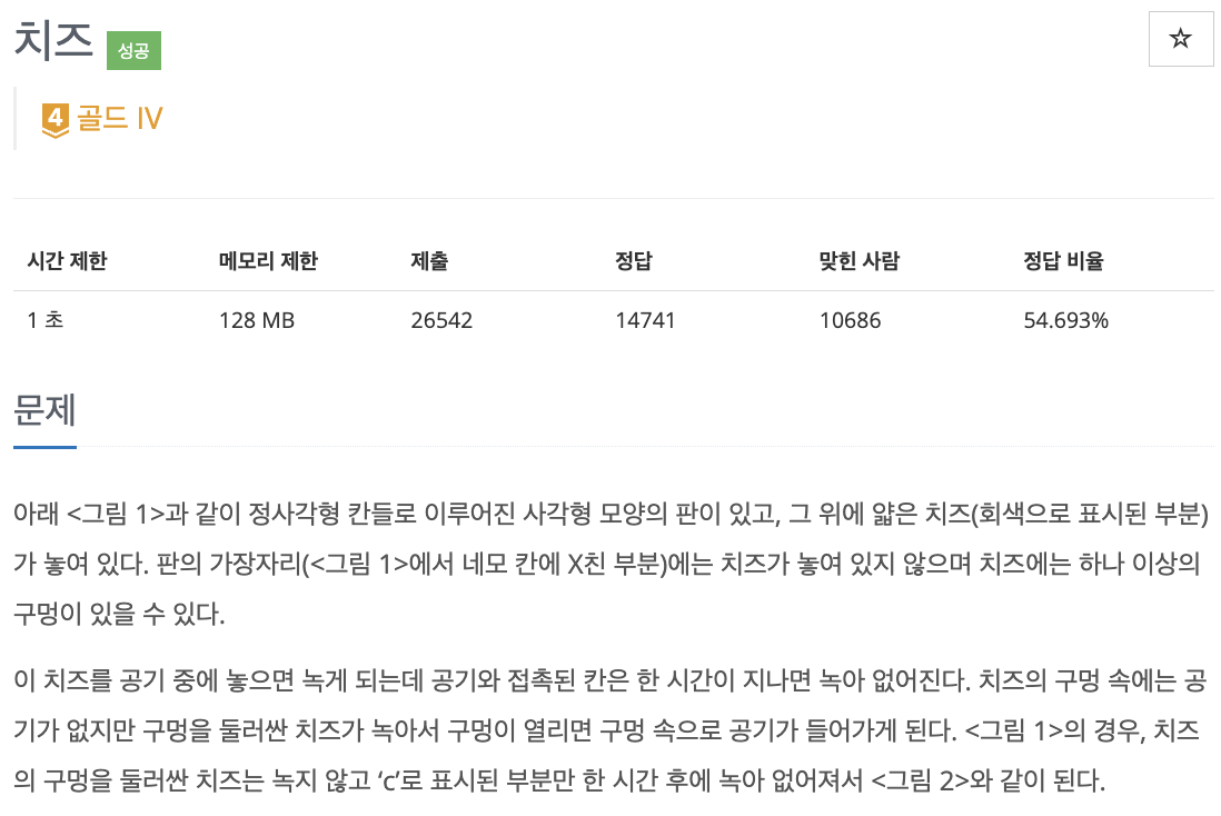 아래 <그림 1>과 같이 정사각형 칸들로 이루어진 사각형 모양의 판이 있고, 그 위에 얇은 치즈(회색으로 표시된 부분)가 놓여 있다. 판의 가장자리(<그림 1>에서 네모 칸에 X친 부분)에는 치즈가 놓
