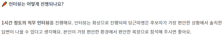 • 면접관은 지원했던 노드 팀 두 분이셨으며, 당근마켓에서 강조한대로 편안한 환경에서 편안한 복장으로 진행하셨다!