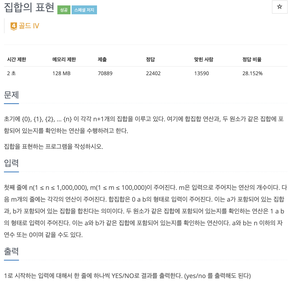 첫째 줄에 n(1 ≤ n ≤ 1,000,000), m(1 ≤ m ≤ 100,000)이 주어진다. m은 입력으로 주어지는 연산의 개수이다. 다음 m개의 줄에는 각각의 연산이 주어진다. 합집합은 0 a b의 형태로 입력이 주어진다. 이는