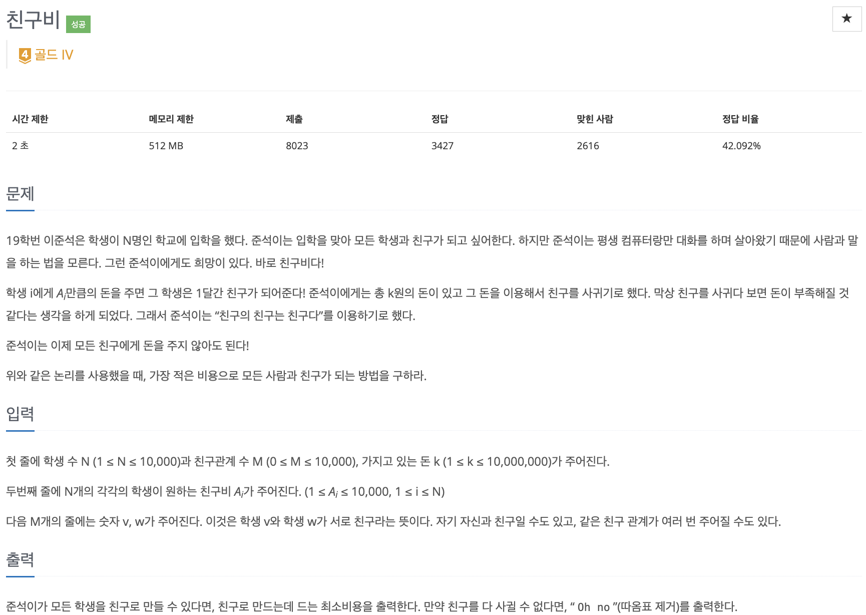 준석이(0번 idx)와 root가 다른 경우 친구비를 정답에 더해주고, 같은 집합으로 묶어주면 된다.